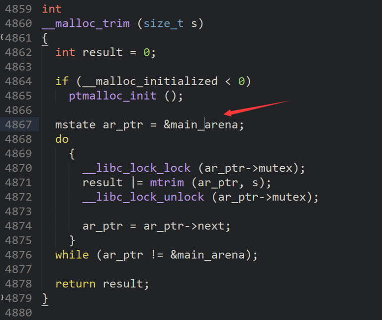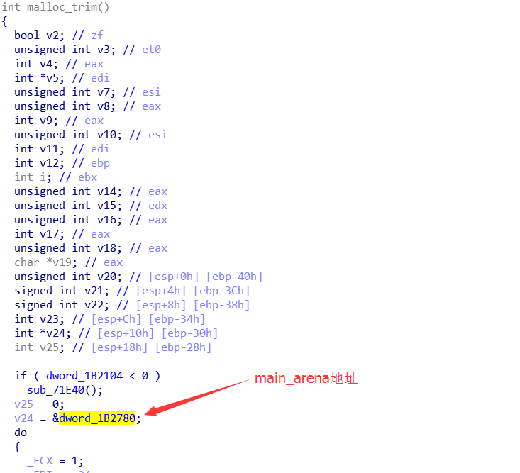 就是32位下的main_arena要去找libc地址就要靠ida去找,通过搜malloc_trim函数