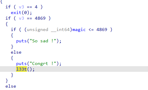 sh.sendlineafter( b ' Your choice : ' , str ( 4869 ).encode())