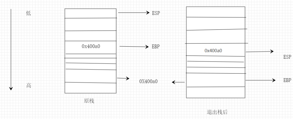 正常情况下退出栈时,esp 指向 ebp 所在位置,ebp 指向 ebp 所存储的位置。等同于执行一个 leave ret 的效果。