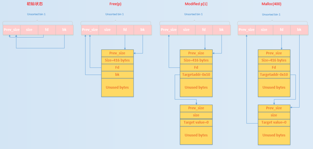 - P的fd指针要修改为 (target addr – 12), bk指针修改成修改的内容